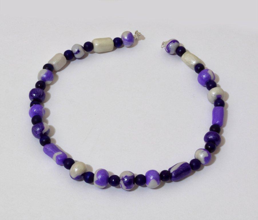 Girocollo in resina lavorata a mano bianca e lilla e perline in legno viola